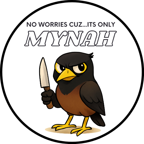 "No worries cuz..it's only MYNAH" myna bird sticker captures the quirky spirit of local island culture with a playful twist. This eye-catching sticker features an adorably unhinged myna bird wielding a knife, perfect for adding personality to laptops, water bottles, skateboards, or anywhere you want to spark a conversation. A must-have for collectors of offbeat humor and tropical vibes.